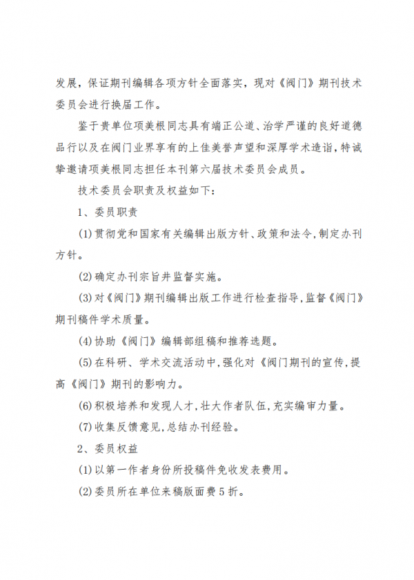 接2021年11月1日《閥門》雜志社邀請函:鑒于黃山良業項美根先生具有端正公道、治學嚴謹的良好道德品行以及在閥門業界享有的上佳美譽聲望和深厚學術造詣,特誠摯邀請項美根同志擔任本刊第六屆技術委員會成員。