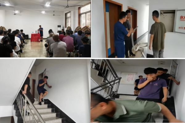 首先,汪隊長講解了滅火器、消防栓等消防器材的基礎知識、注意事項,并做了使用演示。接著,模擬公司辦公大樓出現火災險情時的滅火處置和人員疏散演練。